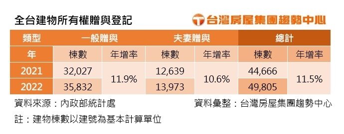 台灣房屋集團趨勢中心觀察內政部統計處資料,發現2022年全台建物所有權贈與量為49,805棟、年增率11.5%,而其中的「夫妻贈與」,2022年為13,973棟、年增10.6%,贈與棟數為近7年來的新高,顯示自從去年全台七個縣市實施囤房稅後,夫妻贈與更成為家庭資產節稅方式之一。