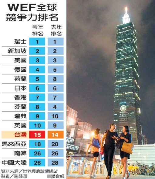 世界經濟論壇(WEF)九月卅日公布二○一五至二○一六年全球競爭力報告,前三名依次是瑞士、新加坡和美國,和去年一樣;台灣排名十五,比去年下滑一名;香港排名第七、中國大陸廿八,與去年相同。