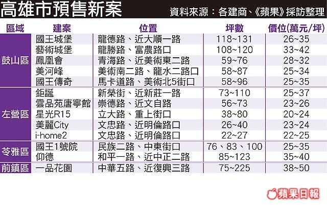 如左營區預售案「鉅誕」隔新榮街面對漢神巨蛋購物廣場,產品規劃73~110坪、每坪25~37萬元,「雲品苑─唐寧館」則鄰近自由黃昏市場及微笑公園,規劃56~73坪、每坪23~26萬元。鼓山區預售案「鳳凰會」、「國王傳奇」均訴求鄰近美術館,「鳳凰會」規劃59~76坪,每坪28~32萬元,「國王傳奇」則為58~96坪、每坪25~35萬元。