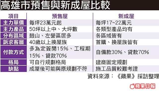 先建後售的新成屋可以看到成品,比較有保障,長久以來高雄市新推案都是新成屋的天下,但今年預售案比例大增,熱度前所未見,目前預售屋佔新推案市場的3成以上,成為高雄推案新趨勢。預售屋以大樓為主,且多為50坪以上的中、大坪數產品,更有許多80坪以上的豪宅產品,主力單價每坪23~30萬元。