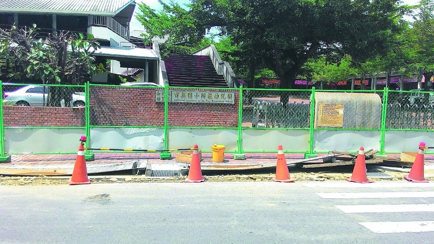 育英國小校門口道路長期施工,影響兒童進出安全。(記者張雁雯/攝影)