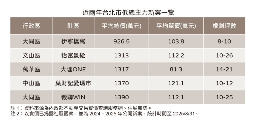 以新青安可貸至最高1000萬元、貸款八成的條件推算,約在總價1250萬元以下房產可相符新青安概念宅,觀察實價揭露資訊,住展雜誌彙整台北市近兩年推出的低總價為主力新案,這等低標僅只一案,乃今年推出在大同區延三夜市附近的套房宅「伊寧橋寓」,平均交易總價為926.5萬元,其餘包括文山區景美一帶的「怡富景絵」、萬華區龍山寺生活圈的「大理ONE」、中山區中崙區域的「葉財記愛瑪市」,和大同區大橋頭地帶的「毅聯WIN」 等案,平均要價都是1300多萬元,台北市房產的低總水位實已與官方認定版本有所落差。