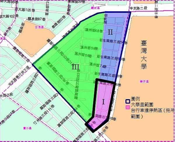 台北市大安區大學里因鄰近公館商圈,商家密集人潮眾多,加上巷道空間有限,以致部分自行車違規停放於路口禁停紅線範圍、人行道、騎樓及標線型人行道,嚴重影響行車安全及阻礙行人通行,市府表示將從3月4日起分階段執行違停自行車拖吊移置及汽、機車取締。