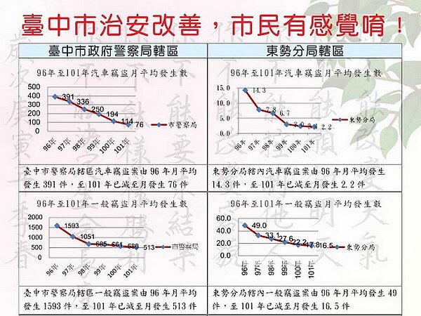 「台中市治安改善,市民有感覺唷!」宣導單上各項數據及治安改善作為,在汽車竊盜防制方面:市警察局轄區最近六年(九十六年至一0一年)汽車竊盜,月平均發生數從三百九十一件下降至七十六件;其中,東勢分局轄區汽車竊盜案,月平均發生數從十四.三件下降至二.二件。