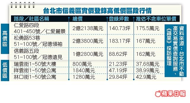 據台北市政府新推出的實價登錄網「台北市不動產交易價格查詢服務」顯示,信義區實價登錄的最高價豪宅,已知每坪成交價約175.5萬元的「仁愛麗景」,及每坪約167萬元的「冠德領袖」。還出現1筆總價1億2800萬元的「冠德遠見」。