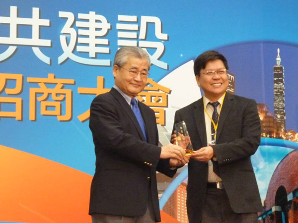 財政部20日在台北國際會議中心舉辦103年民間參與公共建設第1次招商大會,新北市政府積極推動民間參與公共建設有成獲得中央肯定,獲行政院副院長毛治國頒發「102年度招商卓越獎」第一名,由副市長陳伸賢代表受獎。