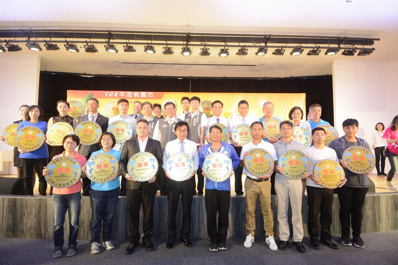 桃園市政府衛生局今年辦理第2屆金牌水質認證,有23家業者獲選,市長鄭文燦昨天頒證表揚活動,最後與業者合影。 記者張裕珍/攝影