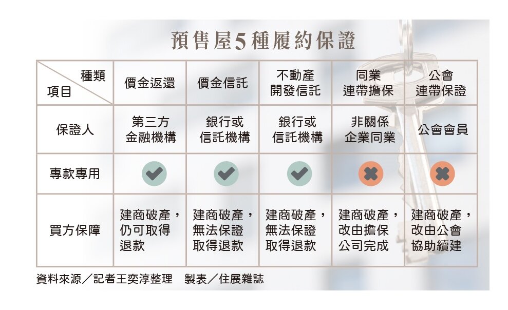 履約保證機制也是另一道重要防線。目前法律規定預售屋契約必須載明的五種機制中,最安全的是「價金返還」及「價金信託」,皆由第三方金融機構協助保管款項,讓建商無法任意動用;買方可運用「七天預審期」,把合約交給信任的地政士或律師再三檢視,並在建商的正式接待中心或公司辦公室簽約,才能避開暗樁。
