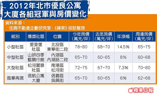 據住商不動產統計,住宅類冠軍社區房價比去年上漲7.3~14.5%;「小型社區」冠軍「愛登堡社區」,房價從去年每坪68~70萬元,漲到78~80萬元,漲幅14.5%最高,「中型社區」、「風華再現」2組冠軍分別為「山妍四季藍鵲行館」、「信航公寓大廈」,一年來房價也都有8%漲幅。