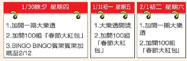 不只如此,初七(2月6日)開獎的威力彩頭獎加碼2億元,5 分鐘開獎一次的BINGO BINGO賓果賓果也從除夕起全玩法獎金加碼14天,台彩預計掀起一波彩券購買熱潮。