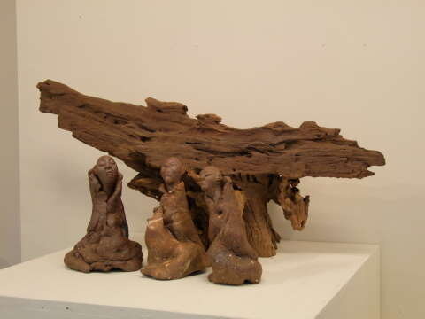 他說,在創作的旅程中,沒有預約的創作,突然靈光開竅心血來潮,或如信手拈來隨形而生,都是最自在的創作。不被期待、祈禱的佛,最能釋放無邊的法力。在閒談中,在候車時,在蟬鳴的午後,大雨磅沱的墨夜,身邊一把土、一支竹籤、心禪自生,對應出人生百態眾生相。老菩薩的雕塑外型中,深藏著閱讀過的旅人靈魂,不知不覺這些泥偶已成大千世界,而心中的”纏”早已焠鍊成”禪”,一如鏡水對應過往。