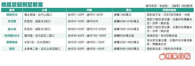 台中市機能景觀宅除了大樓外,也有不少景觀別墅,集中在7期潮洋溪、12期文修公園等低密度開發重劃區,因位處市中心精華區段,又有河岸、公園景觀加持,地價居高不下,產品以地坪40坪以上、建坪百坪起跳的電梯豪墅為主,總價超過6000萬元。台中市機能景觀宅以大樓為主,少數重劃區如7期西側、東8期、12期北側等,有公園、河岸,但因屬於低密度住宅區,容積率、建蔽率不高,新推出的機能景觀宅以別墅為主。