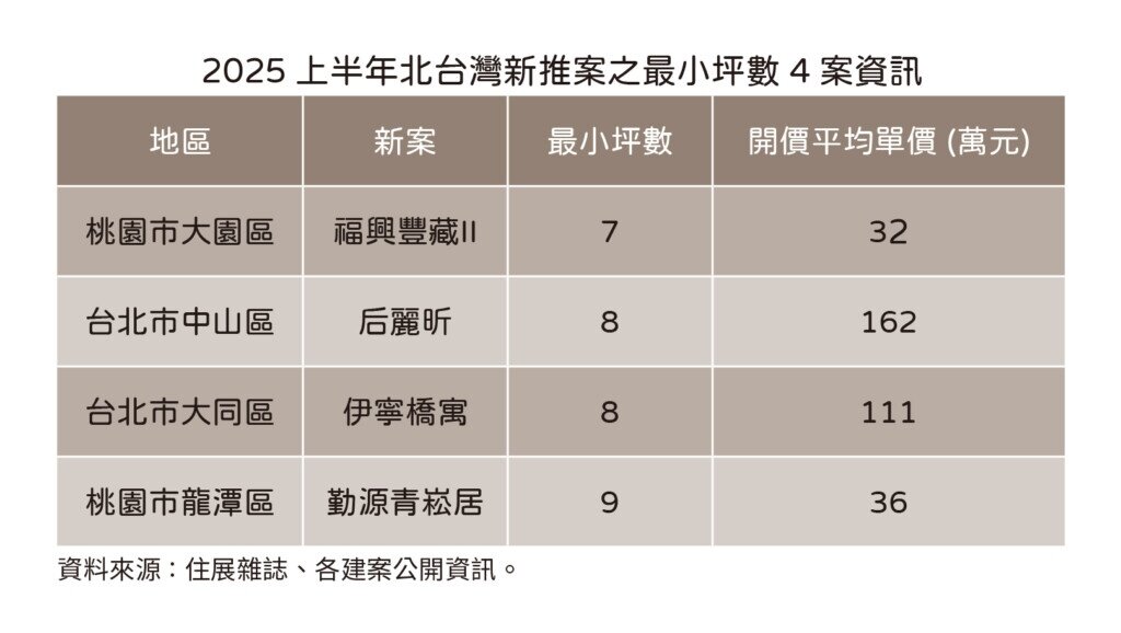 房市冷氣團下讓低總小宅還有發揮空間,住展雜誌彙整今年上半年北台灣推出的最小坪數新案,有4案建商壓縮空間推出最小未達10坪規劃,四小天王分別為7坪的桃園市大園區「福興豐藏II」、8坪的台北市中山區「后麗昕」與大同區「伊寧橋寓」,和9坪的桃園市龍潭區「勤源青崧居」,不乏傳出銷售佳績,不敗地位可見一斑。