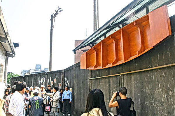 圍牆的另一端掛著一艘鴨母船和一支竹篙,訴說早期宜蘭城和鄂王地區,靠著西勢大溪(宜蘭河)船運交通的發展故事,還透過藝術的呈現,標示出堰空頭(渡船頭)等水路位置,頗富歷史文化意義與價值。