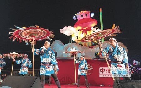 中台灣燈會由西方潮牌的「大嘴猴」擔綱,日本鳥取縣國府町因幡傘舞保存會21日也到台中公園演出,舞者們一面唱著歌謠,一面舞動傘,展現出傳統「因幡傘舞」的氣勢,讓台中市的元宵燈會吹起濃濃國際風。