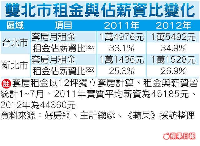好房網統計發現,台北市獨立套房租平均月租金為1萬5492元,較去年增3.4%,租金與實質平均薪資佔比提高到34.9%,較去年同期多出1.8個百分點。新北市租金相對便宜,但套房月租金佔薪資26.9%,較去年同期高出1.6個百分點。