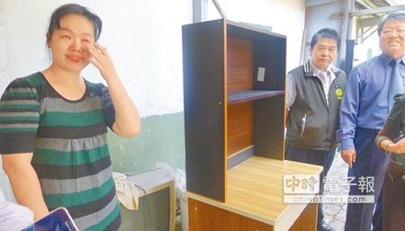 與一對高一和國三兒女窩居在10坪大平房,45歲侯小姐是歸仁區低收入戶,昨添接過社會局長陳榮枝、區長陳英裕等人帶來的書桌,當場感動落淚。