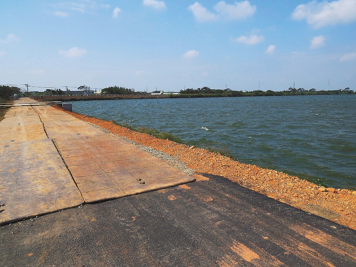 黃色小鴨即將進駐的新屋鄉後湖塘,昨天還在整理,地方擔心遊客拍照會發生意外。(記者林麗如/攝影)