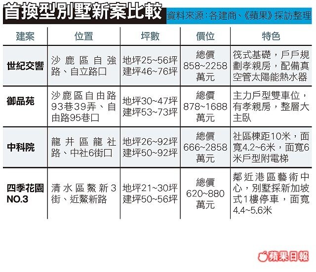 台中市包括沙鹿、龍井、清水等地區,是透天別墅推案主力區段,目前別墅新案主力總價800~1200萬元,首換族以不到千萬元左右預算或再略增預算,就可實現換住別墅的夢想,少數新案如龍井「中科院」,最低總價更只要666萬元起。