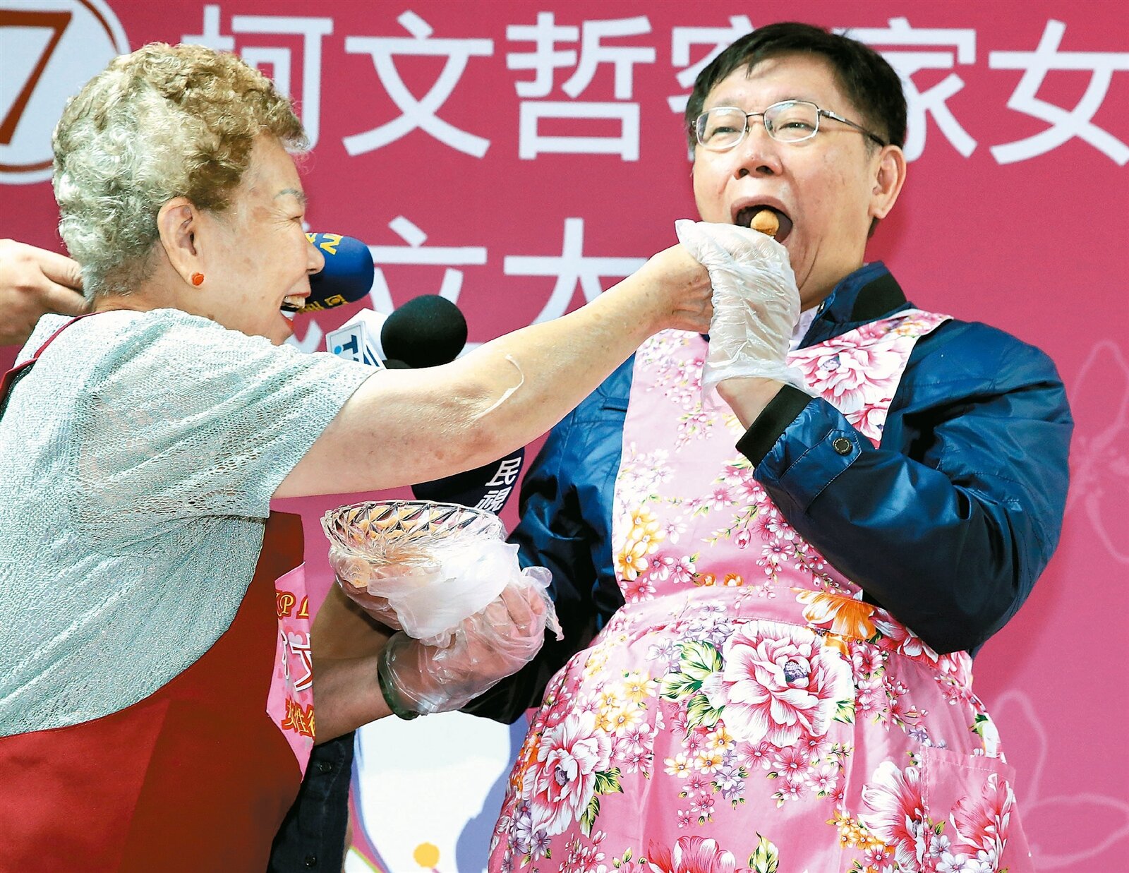 搶攻婦女選票,台北市長無黨籍參選人柯文哲上午出席客家女性後援會成立大會,被安排穿上花圍裙搗麻糬,柯文哲顯得害羞,面露苦笑。