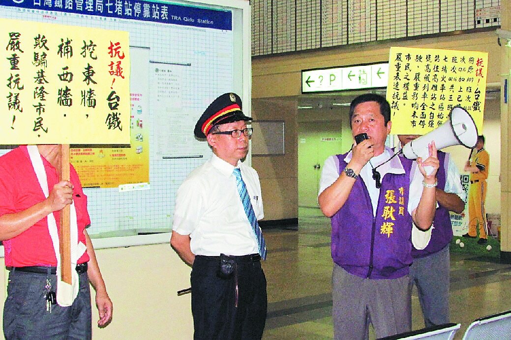 市議員張耿輝昨天上午到七堵火車站抗議,他說,許多民眾反映,台鐵美其名加開了直達通勤車,但從16日起,6點6分107車次、7點16分111車次及8點16分115車次共3班次,由七堵發車南下高雄的自強號列車停駛,影響到民眾搭車權益。