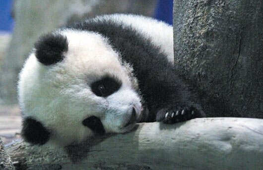 明天是大貓熊「圓仔」滿半歲生日,明天上午九時起牠開始和民眾見面;昨天圓仔萌樣首度在媒體鏡頭前曝光,由保育員抱著亮相時,絲毫不怯場,一股腦就從地上爬到一層樓高的棲架,不過圓仔的「電量」只有廿分鐘,就體力不支睡著。