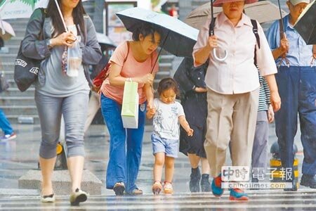 明天颱風最接近台灣,受外圍環流影響,東半部及南部將出現間歇性大雨及長浪。圖為台北市9日突然下起傾盆大雨,媽媽牽著孩子過街。(杜宜諳攝)