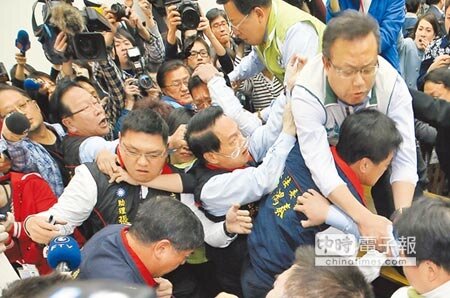《兩岸服貿協議》審查出現大逆轉!朝野昨爆發激烈肢體衝突,一片混亂中,國民黨發動突襲,以人數優勢保護國民黨內政委員會召委張慶忠,趁機宣布服貿已逾3個月審查期限,依法視為已經審查,全案送院會存查,等於將戰場拉到院會;民進黨則質疑會議無效,揚言今將全面杯葛院會,不讓閣揆江宜樺上台總質詢。
