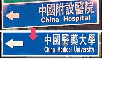 台中市政府交通局懸掛的中國醫藥大學附設醫院路牌,被學生發現醫院英文名稱,被縮寫為China Hospital(中國醫院),經本報獨家報導後,獲市府具體回應,在原本出現錯誤的3處路口的路牌,全都更改名稱為「中國醫藥大學」,英文名稱也更正為China Medical University,獲得醫院、校方及師生肯定。