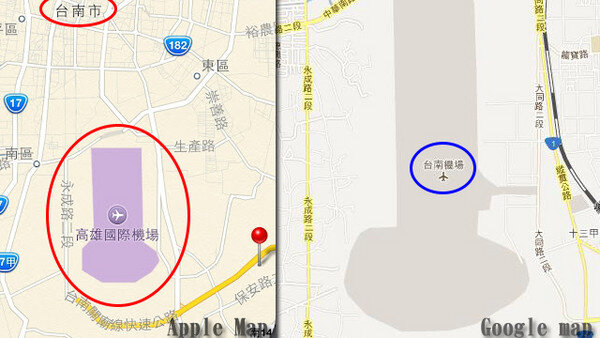 根據知名科技部落客「硬是要學」的測試,iOS6版的台灣地圖有些誇張的錯誤;搜尋「台南火車站」會找到奇怪的地方去,仔細看一下圖片中的機場,咦?高雄小港機場什麼時候跑到台南來了。