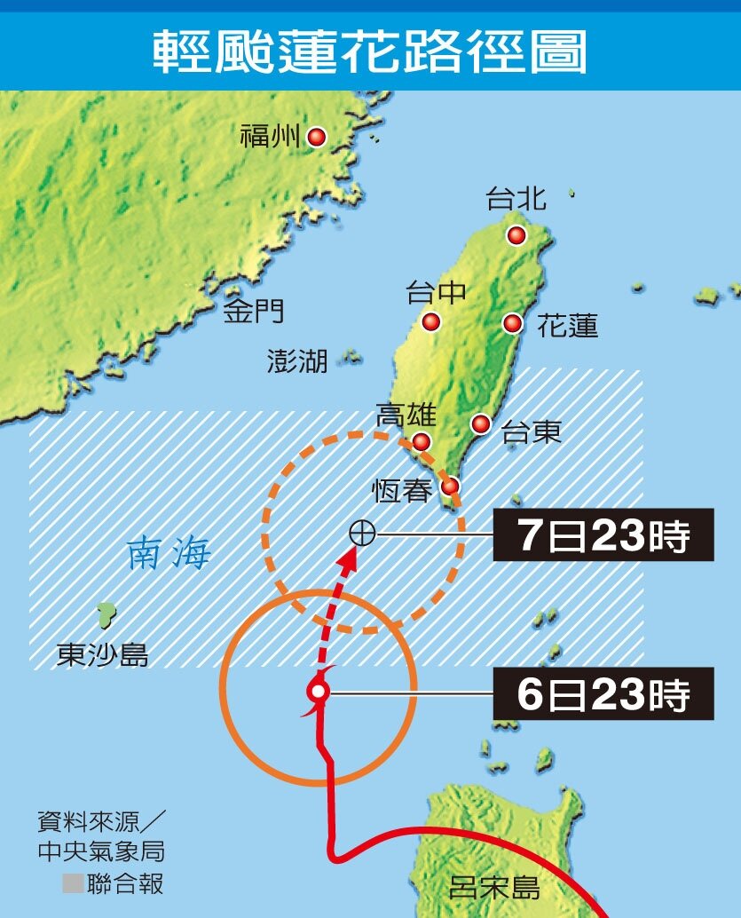 氣象局今晨發布輕颱蓮花的陸上颱風警報,今天中南部、花東地區和澎湖、金門等地會有明顯風雨,北部地區則有短暫陣雨;蓮花周三、周四影響台灣最劇,提醒中南台灣民眾須做好防颱準備。