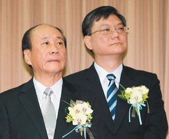 經濟部昨天舉行新、舊任經濟部長交接典禮,經濟部特別為卸任的部長張家祝(左)剪了一段回顧影片,張家祝與新任部長杜紫軍(右)並肩同看。(記者林澔一/攝影)