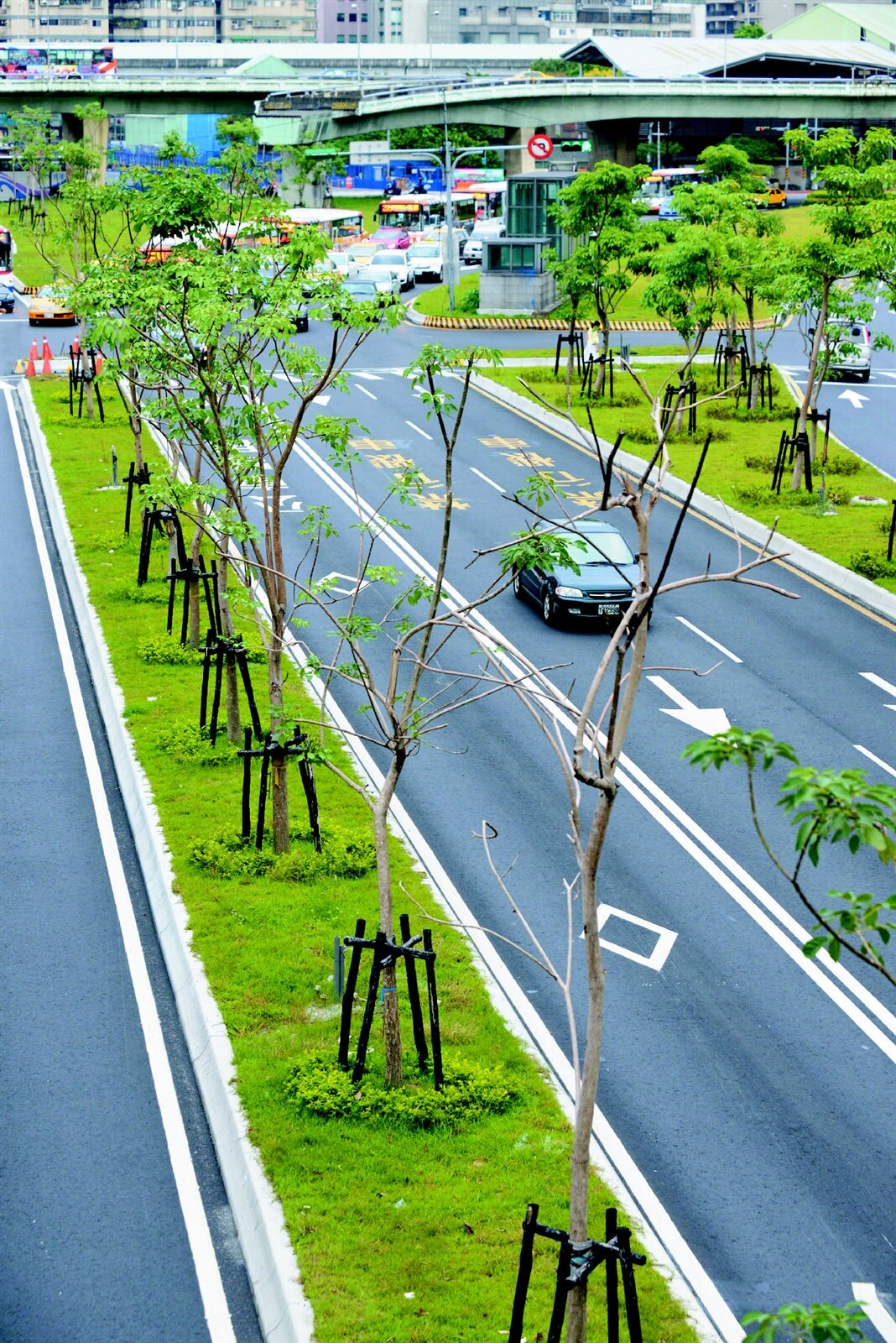 同樣是鐵路地下化後興闢的艋舺大道,地底有高鐵、捷運。去年打造林蔭大道,不敢向下深挖,樹穴覆土深度僅一公尺。