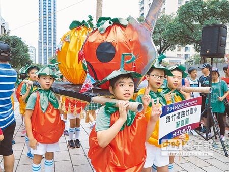 第5屆兒童藝術教育節登場,親師生組成特色造型隊伍,熱鬧踩街,可愛指數也破表。(記者李義/攝影)