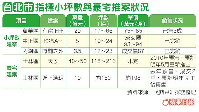 劉楚詳指出,上月推羅斯福路三段預售案「快客A+」與捷運西湖站200公尺旁推案「時間之外」,皆為20多坪、單價百萬以下產品,公開2~3周即完銷,而看準總價2千萬元以下小宅投資熱,明年第1季在捷運士林站旁推總銷4.5億元、22坪小宅建案,估每坪88萬元。