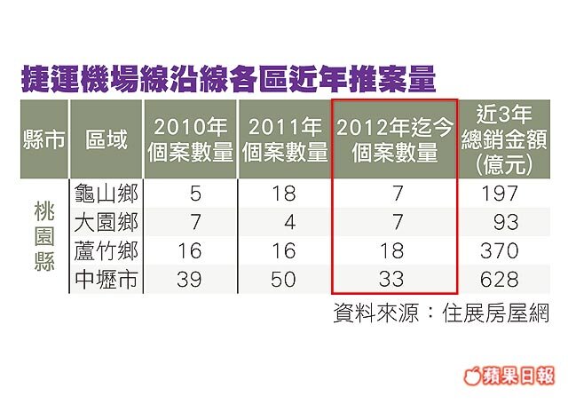 新理想廣告副總經理莊聖雄指出,以成長性而言,A17領航站至A19桃園體育園區站所構成之高鐵特區,後市能見度最佳。除機場捷運,該區早已擁有高鐵及國道2號等主要交通機能,便利性高且腹地廣,是建商與投資客鎖定主戰區,至明年第1季尚有15個新案將陸續亮相,預估通車後還有2成漲幅可期。