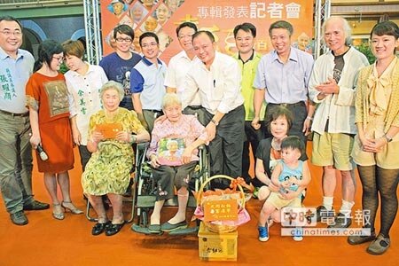 宜蘭縣長林聰賢(中),將「幸福百分百─103年宜蘭縣百歲人瑞專輯」等禮物,致贈給百歲人瑞們,表達祝賀之意。(截取自中時電子報)