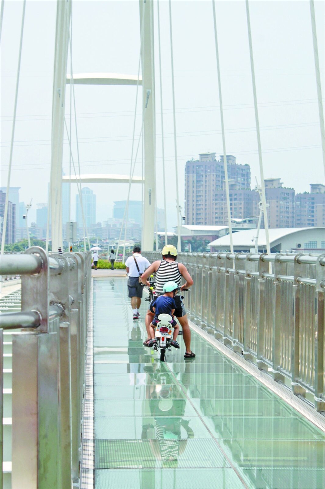 橋上透明天空步道,視潮汐距下方溪水約12至15公尺高;諶錫輝說,步道兩端貼有告示,自行車不要騎入步道,行經天空步道勿著高跟鞋或以傘、拐杖等尖銳物品損壞玻璃表面,但部分自行車族視若無睹,甚至一副「我就是要騎,你能怎樣」的態度。