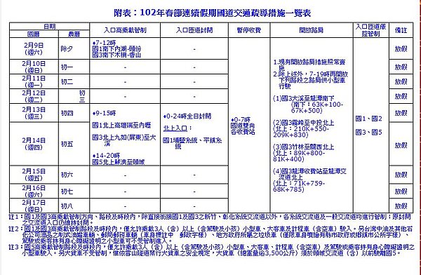102年春節連續假期國道交通疏導措施一覽表。(圖/擷取自交通部國道高速公路局)
