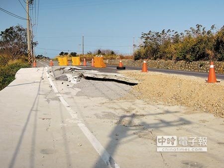 苗栗縣通霄鎮苗37線坪頂段自去年8月因颱風造成路面塌陷,經過半年仍未能恢復原狀,讓附近居民抱怨政府龜速修路。(記者江詩筑/攝影)
