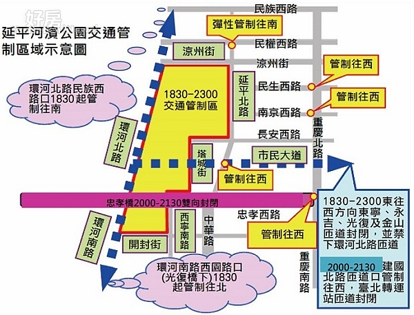 第1階段為18:30-23:00:管制範圍為涼州街以南、延平北路以西、開封街以北及環河北路(含)以東區域;快速道路部分,市民高架除封閉東寧、永吉、光復、金山等往西上匝道外,並禁止往西車流下環河北路匝道;