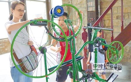 西班牙團隊利用廢腳踏車打造益智遊戲裝置,小朋友玩得不亦樂乎。(記者江慧珺/攝)