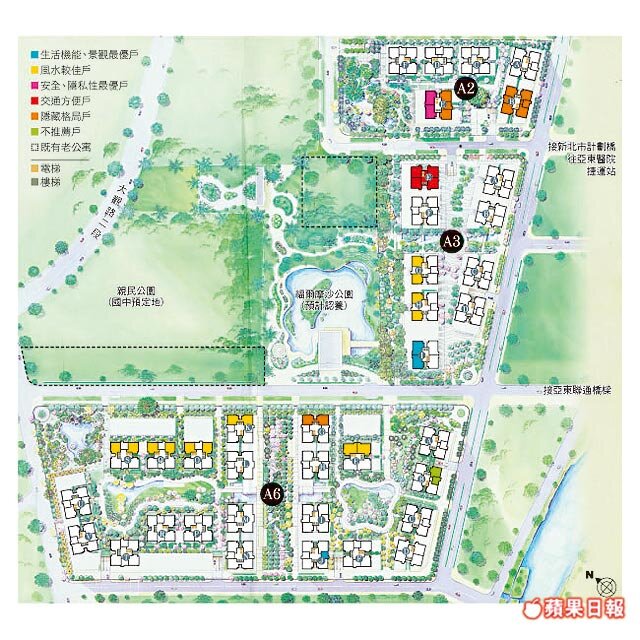 A3區屬於綠帶的開放性空間,若想居住較單純安靜的環境,不妨考慮A2與A6區封閉型社區,其中A2區E棟戶別的E1、E2戶面對景觀生態池,與鄰棟的B、D棟棟距大,不會產生陽台面對鄰戶的問題,且社區周邊無車道經過,是安全、隱私性佳的棟別。
