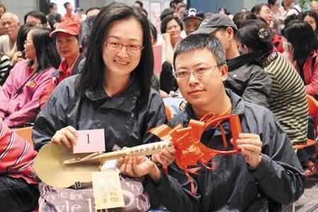 「助孕」金鏟子魅力驚人,比演唱會門票還搶手!昨一早新北市政府外就出現數百公尺人龍,綿延到市民廣場2樓迴廊,全都衝著民政局追加發放的500支金鏟子。搶到頭香的林姓夫妻前天下午5點就來排隊,希望能搶到好「孕」。