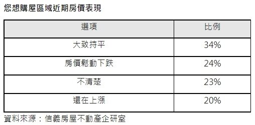 不過若是指受訪者對購屋區域近期房價表現的看法,34%多數受訪者表示「大致持平」,不過有20%表示「還在上漲」、24%表示「房價鬆動下跌」。顯示現階段的房價漲跌互現,但多數呈現持平狀態。