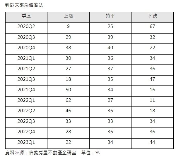 信義房屋從12月7日到14日針對官網網路使用者進行調查,回收1200份樣本資料,對於未來房價的看法,發現僅22%受訪者看漲,為2021Q3的18%以來6季新低,34%受訪者認為房價持平,低於前一季的36%;高達44%受訪者認為房價會下跌,也是2021Q3的47%以來新高。