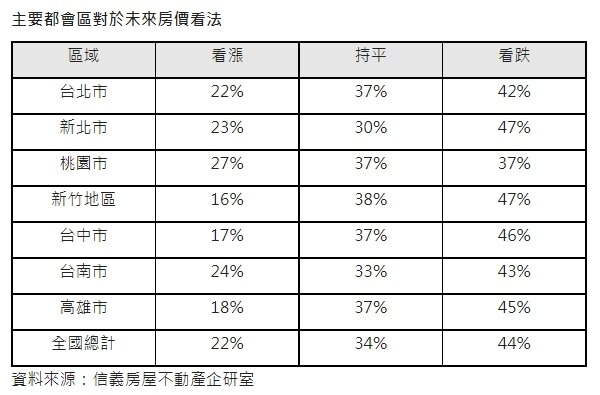 經濟成長不如預期,股會市場也不佳,民眾對房市的信心也顯得低落。信義房屋針對網友調查明年第1季房價的預期看法,發現購屋人的房市信心持續下滑,高達4成預期房價下跌,為6季以來新高,其中以新竹、台中、高雄逾45%看跌且不到2成看漲的差距最明顯。