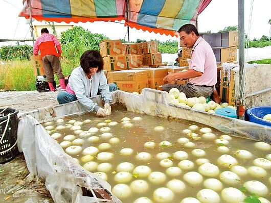 台南市後壁區洋香瓜,已歷經潭美、康芮颱風兩次淹水,產量僅剩1/3,瓜農怕天兔颱風再肆虐,這二天清晨5點多就搶收並立即清洗,以便到市場販賣。(記者吳政修/攝影)