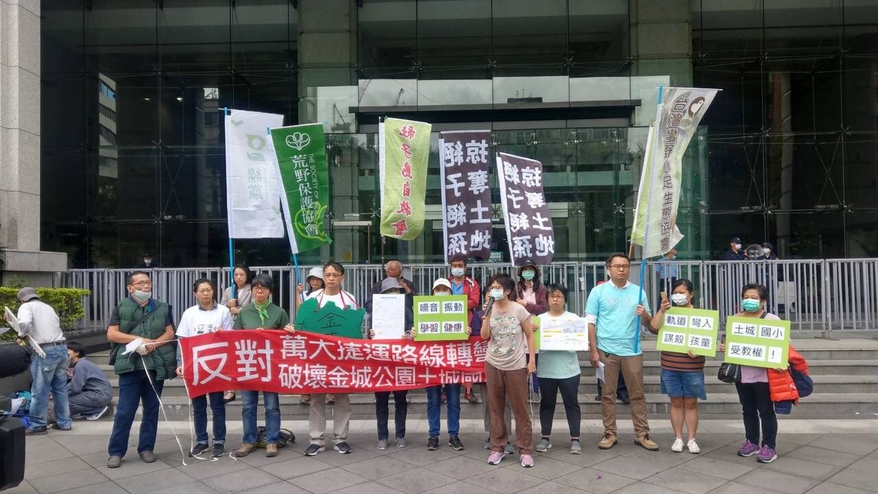 抗議民眾表示,北捷規畫萬大線2期LG11土城段沿線段,原本設計直行在金城路上,後以施工便利為由,未送審環差報告通過,硬將軌道與站體彎入金城公園,造成綠地全毀,也毀壞土城國小圍牆設置橋墩軌道,軌道離民宅最近僅4公尺,離教室也僅10.4公尺,「孩童要怎麼上課」?