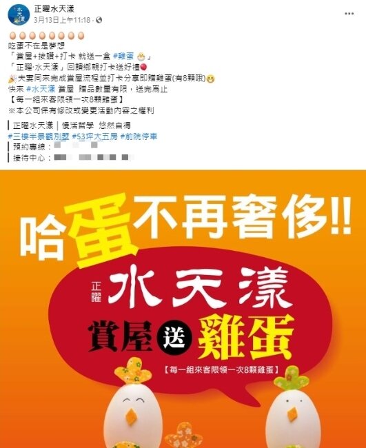他補充說明,「正曜水天漾」推出看房子送雞蛋之前,原本就有客戶下訂,市場詢問度也很不錯,這次活動「只是搭配時事讓更多人能注意到我們的產品」,但強調抱持敦親睦鄰的心態歡迎踴躍取用,「就算不是來買房子或者恰好路過,同樣歡迎進來案場走走,看完介紹或許能多留下一組客戶,或是讓更多人發現我們的產品,這樣就值得了。」